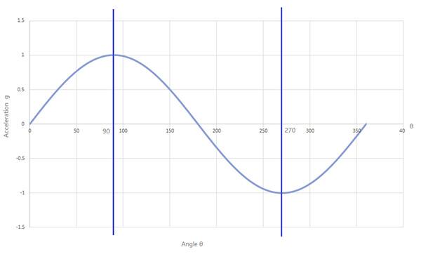 根據(jù)tan(θ)函數(shù)特性可以看出,隨著θ增大,增量靈敏度越來(lái)越高。同時(shí)可以看出,如果要計(jì)算系統(tǒng)最小靈敏度,可以取θ=0時(shí)輸出變化的增量。根據(jù)公式Ax=sin(θ)*1g,可以近似計(jì)算最小靈敏度。當(dāng)θ=0時(shí),S[g]= ΔAx= sin(P)*1g , 其中P為系統(tǒng)要求的最小步長(zhǎng)。
