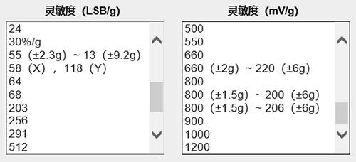 靈敏度(LSB/g<)主要針對(duì)數(shù)字輸出加速度傳感器,代表一個(gè)重力加速度(g)下,輸出能區(qū)分多少位LSB。上面已經(jīng)根據(jù)應(yīng)用要求推導(dǎo)出,假設(shè)應(yīng)用要求最小分辨率為1°,靈敏度需要大于58LSB/g。那么可以根據(jù)這一結(jié)果直接在參數(shù)欄里選擇。