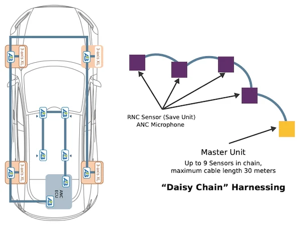 使用A2B技術(shù),可以采用菊花鏈方式連接傳感器,這與通常使用的星形模式相反。這顯著減少了電纜重量和相關(guān)的故障。