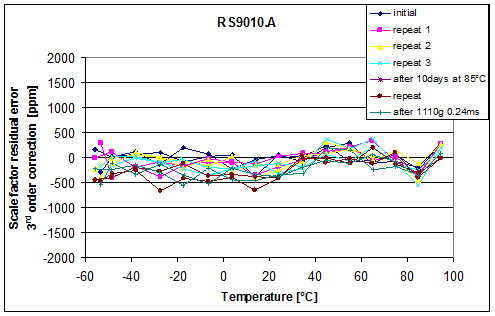 以下四張圖顯示了RS9010.A加速度傳感器的初步表現(xiàn)。我們可以看到,經(jīng)過沖擊和長期老化后,所有的零偏漂移包括遲滯都優(yōu)于1.5mg, 且標(biāo)度因數(shù)穩(wěn)定性優(yōu)于150ppm. 此外,RS9010.A的振動整流誤差可比擬機電(Q-FLEX)規(guī)格。這些綜合性能使得RS9010.A成為未來的高性能航姿系統(tǒng)的最佳候選產(chǎn)品之一。