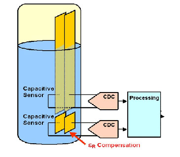 在液位傳感器中,一對固定的極板被浸入液體中待測。制造商能夠以非常低的成本實(shí)現(xiàn)印刷導(dǎo)體。第二對極板被附著在底部區(qū)域,讓電介質(zhì)因溫度或其它被檢測效應(yīng)而變化,如下圖所示。