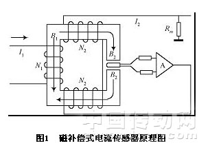 磁補(bǔ)償式電流傳感器由原邊線圈、聚磁磁芯、霍爾電極、次級(jí)線圈、放大電路等部分組成,如圖1 所示,其工作原理為:原邊電流I1 通過(guò)原邊線圈N1 產(chǎn)生磁場(chǎng)B1 , 其磁力線集中在磁芯氣隙周?chē)?nèi)置在磁芯氣隙中的霍爾電極產(chǎn)生和原邊磁力線成正比的mV 級(jí)電壓, 后續(xù)電路將這個(gè)微小信號(hào)轉(zhuǎn)換成副邊補(bǔ)償電流I2 , I2 流過(guò)次級(jí)線圈N2 產(chǎn)生補(bǔ)償磁場(chǎng)B2 。當(dāng)原邊與副邊的磁場(chǎng)達(dá)到平衡時(shí), 補(bǔ)償電流I2 即可反映原邊電流I1 的值,即I1 N1 = I2 N2 。輸出電流I2 經(jīng)過(guò)測(cè)量電阻Rm , 則可以得到一個(gè)與原邊電流成正比的大小為幾伏的電壓輸出信號(hào)。