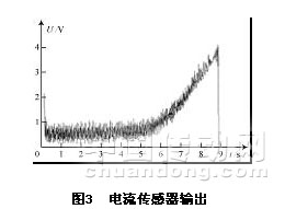 根據(jù)上述方法,選用CS005LX 型霍爾電流傳感器,原邊電流測(cè)量范圍- 5~5 A ,副邊額定輸出電壓4 V ,安裝在一臺(tái)220 kV 沿相線巡線機(jī)器人實(shí)驗(yàn)樣機(jī)上。通過(guò)帶電運(yùn)行實(shí)驗(yàn),測(cè)得電流傳感器在夾緊過(guò)程中的輸出如圖3 所示。