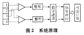 本系統(tǒng)中使用的光柵傳感器輸出的是4路相位差為90°的正弦信號,因此需要對傳感器的輸出信號進行整形處理。本設計中采用了由運放LM393構成的差分放大器,將光柵傳感器輸出的4路信號分別送入2個差分放大器的輸入端,從差分放大器輸出的2路信號其相位差為90°,整個系統(tǒng)框圖如圖2所示。