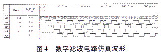 圖4是數(shù)字濾波電路的仿真波形圖,從圖中可以看出,當輸入信號ina或inb出現(xiàn)毛刺時,經(jīng)過數(shù)字濾波后,輸出波形a和b中已看不到毛刺。在仿真過程中需要注意的足輸入信號ina和inb與clk之間的頻率設置,如果設置不合適,仿真將會失敗。