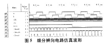 光柵尺信號的細分與辨向足提高光柵尺測量精度的關鍵性一步,沒計者需要綜合考慮辨向與細分的復雜性。在辨向時,是對細分后的信號進行辨向,而不是在細分前進行辨向,否則不能提高測量精度。本測量系統(tǒng)中是先細分、后辨向。電路仿真波形如圖5所示。