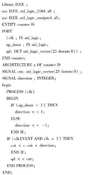 本系統(tǒng)中的計數(shù)器采用VHDL進行設計,輸入信號定義為時鐘信號和方向信號,輸出信號定義為24位的計數(shù)結果。用VHDL實現(xiàn)的24位可逆計數(shù)器功能的原程序如下: