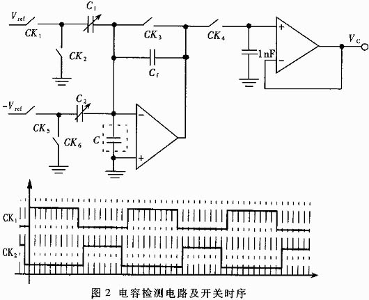 在測(cè)量過(guò)程中,先將未知電容(C1、C2)充電至已知電壓Vref,然后讓其放電。充、放電過(guò)程由一定時(shí)序控制,不斷重復(fù),使未知電容總處于動(dòng)態(tài)的充放電過(guò)程。C1、C2連續(xù)地放電,電流脈沖經(jīng)過(guò)電荷放大器轉(zhuǎn)換為電壓。再經(jīng)過(guò)采樣保持器,得到輸出Vc。將公式ΔC=2C0·x/d0代入,可得電容檢測(cè)電路的傳遞函數(shù)為:Vc/x=-[2VrefC0/Cfd0]