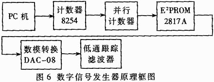 一般的RC振蕩電路生成的正弦波頻率靠改變R、C值來(lái)調(diào)節(jié),不能連續(xù)大范圍調(diào)節(jié)。所以,設(shè)計(jì)中采用數(shù)字方法合成模擬波形,其原理見(jiàn)圖6。圖6中8254為軟件可編程計(jì)數(shù)器。其包含3個(gè)獨(dú)立的16位計(jì)數(shù)器,計(jì)數(shù)最高頻率可達(dá)8MHz,設(shè)計(jì)中輸入3MHz的時(shí)鐘,將2個(gè)計(jì)數(shù)器串連使用,這樣可以增加頻率控制范圍。8254產(chǎn)生的方波信號(hào)作為后面并行計(jì)數(shù)器的計(jì)數(shù)脈沖輸入。并行計(jì)數(shù)器由2片74LS161組成8位二進(jìn)制循環(huán)計(jì)數(shù)器。74LS161計(jì)數(shù)到最大值時(shí)會(huì)自動(dòng)清零,重新開(kāi)始計(jì)數(shù),其輸出可作為E2PROM 2817A的地址信號(hào)(即每個(gè)正弦周期內(nèi)采樣點(diǎn)數(shù)為256個(gè))。2817A的數(shù)據(jù)讀取時(shí)間為150ns。設(shè)計(jì)電路時(shí)將它的片選和讀信號(hào)均設(shè)為有效,以提高數(shù)據(jù)讀取速度。D/A轉(zhuǎn)換采用DAC-08電流輸出型D/A轉(zhuǎn)換器。電路輸出時(shí)間85ns,放大器采用高速高精度運(yùn)放OP-37,同理,D/A轉(zhuǎn)換器的片選和轉(zhuǎn)換開(kāi)始信號(hào)總為有效,其輸出跟隨輸入變化,提高轉(zhuǎn)換速度。實(shí)驗(yàn)結(jié)果表明,此信號(hào)發(fā)生器完全可以生成10kHz以內(nèi)可調(diào)頻的正弦波。而且使用可編程計(jì)數(shù)器8254,輸出正弦波的頻率可以用軟件方法調(diào)節(jié)。如果想輸出非正弦波形,只要修改E2PROM的數(shù)據(jù),就可以輸出任意形狀的周期波形。