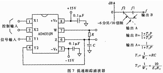 數(shù)字信號(hào)發(fā)生器具有控制靈活的優(yōu)點(diǎn),但是輸出信號(hào)不夠平滑,其中會(huì)有臺(tái)階波。在對(duì)信號(hào)要求比較高的場(chǎng)合,還需要進(jìn)行濾波。本設(shè)計(jì)中信號(hào)的頻率變化范圍很大:幾百赫茲到10千赫茲。為了進(jìn)一步提高信號(hào)質(zhì)量,采用AD633模擬乘法器構(gòu)成低通跟蹤濾波器,其原理如圖7。