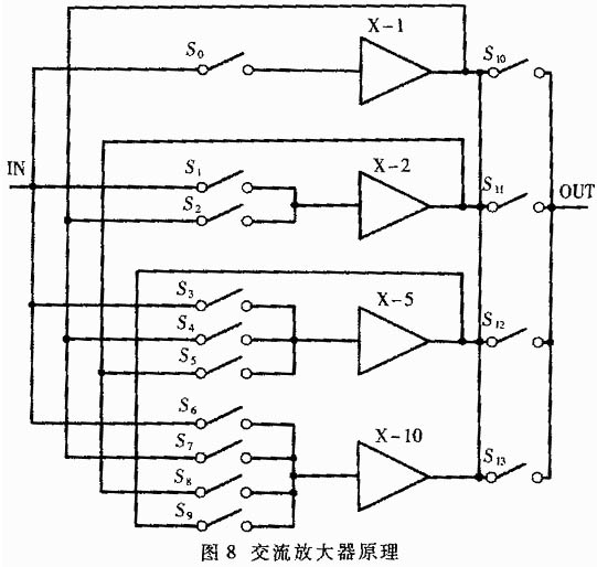 交流放大器由4個(gè)放大倍數(shù)為-1、-2、-5、-10的運(yùn)算放大器級(jí)聯(lián)組成,進(jìn)一步放大被測(cè)信號(hào),同時(shí)調(diào)整幅值以便適應(yīng)解調(diào)器的輸入。圖8中的開(kāi)關(guān)選用ADG211模擬開(kāi)關(guān),通過(guò)控制模擬開(kāi)關(guān)的開(kāi)合,可以任意選擇某級(jí)或某幾級(jí)放大器參加工作,實(shí)現(xiàn)對(duì)放大倍數(shù)正負(fù)1、2、5、10、20、50、100的整倍數(shù)調(diào)整。例如,將模擬開(kāi)關(guān)S0、S2、S8、S13閉合,其他開(kāi)關(guān)全部打開(kāi),交流放大器的總放大器數(shù)即為:(-1)×(-2)×(-10)=-20。