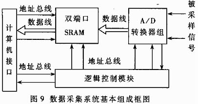 系統(tǒng)基本組成原理如圖9。主要有雙端口RAM、邏輯控制模塊、A/D轉(zhuǎn)換器組、計(jì)算機(jī)接口。機(jī)通過(guò)接口啟動(dòng)邏輯控制模塊后,CPU資源向其他請(qǐng)求開(kāi)放,邏輯控制模塊發(fā)控制信號(hào)啟動(dòng)A/D轉(zhuǎn)換器并進(jìn)行采樣,并將轉(zhuǎn)換結(jié)果存入雙端口RAM。當(dāng)RAM中的數(shù)據(jù)達(dá)到一定數(shù)量時(shí),邏輯控制模塊向計(jì)算機(jī)發(fā)出中斷請(qǐng)求。主機(jī)接到請(qǐng)求后進(jìn)入中斷服務(wù)程序,向邏輯控制模塊發(fā)出命令,決定是否繼續(xù)采樣,并將RAM內(nèi)的數(shù)據(jù)讀入內(nèi)存。