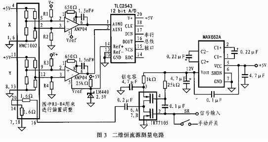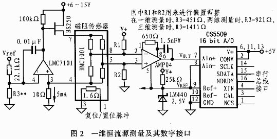圖2所示是一個一維恒流源的測量和數(shù)字接口電路,其二維恒流源的測量及數(shù)字接口電路如圖3所示。