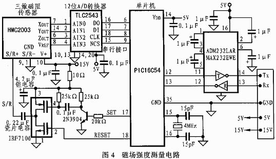 圖4是一個使用HMC2003磁敏傳感器、12位A/D轉(zhuǎn)換器、PIC16C54單片機(jī)、RS232接口和置位/復(fù)位電路構(gòu)成的三維磁場測量電路。
