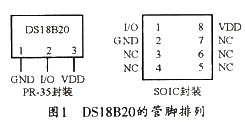 DSl8B20采用3腳PR-35封裝或8腳SOIC封裝,其管腳排列如圖l所示。圖中,GND為地;I/O為數(shù)據(jù)輸入/輸出端(即單線總線),該腳為漏極開路輸出,常態(tài)下呈高電平;VDD外部+5V電源端.不用時(shí)應(yīng)接地。
