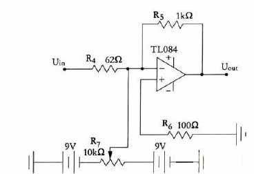 R4、R5、R6和TL084CN構(gòu)成放大器,在本系統(tǒng)的實(shí)驗(yàn)測試中,需要該部分的運(yùn)算放大器放大150倍左右,因此選擇R4=62Ω,R5=1kΩ,此時(shí):