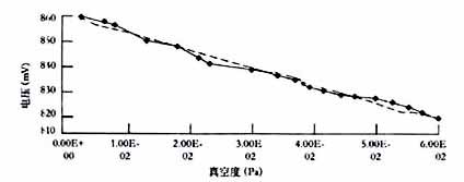 根據(jù)測量的數(shù)據(jù),可以得出10-2~10-3Pa范圍內(nèi)真空度與輸出電壓的關(guān)系曲線,如圖5所示?梢钥闯鲭S著真空度的增高,輸出電壓值增大,真空度越高電壓變化越小。這是由于真空度越高,真空傳感兩個(gè)腔體之間的壓力差越小,傳感器的硼硅膜變化越小,電容值變化也越小,隨之電壓變化越小。