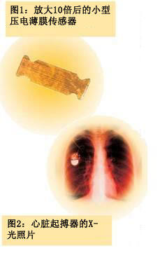 壓電式傳感器是一個(gè)很小的懸臂,懸臂的重量集中于一端且隨著人體的運(yùn)動(dòng)而跳動(dòng)。每當(dāng)病人運(yùn)動(dòng)時(shí),傳感器就會(huì)產(chǎn)生一個(gè)信號(hào)。心臟起搏器接收到這些信號(hào),然后使心臟也相應(yīng)的博動(dòng)。如果病人在休息,信號(hào)為零,則心臟起搏器會(huì)使心臟以正常頻率博動(dòng),例如大約70次/分鐘。傳感器能區(qū)分出各種活動(dòng),例如走路、跑步、或是其他身體活動(dòng)。傳感器的輸出和運(yùn)動(dòng)量成正比。圖1和圖2所示的即為一個(gè)被嵌入在一個(gè)心臟起搏器中的小型化壓電薄膜振動(dòng)傳感器,該傳感器的長(zhǎng)度為15/100英寸。