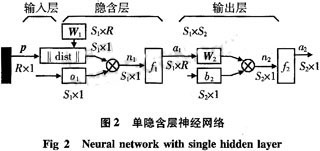 其中,p為輸入矢量,R為輸入矢量維數(shù),S1為隱含層神經(jīng)元個(gè)數(shù),S2為輸出層神經(jīng)元個(gè)數(shù),W1為隱含層神經(jīng)元權(quán)值矩陣,W2為輸出層權(quán)值矩陣,b1為隱含層神經(jīng)元閥值,b2為隱含層神經(jīng)元閥值,n1為隱含層輸入節(jié)點(diǎn),n2為輸出層節(jié)點(diǎn)。f1為S型函數(shù),f2為purelin型函數(shù)。神經(jīng)網(wǎng)絡(luò)算法是用于前饋多層網(wǎng)絡(luò)的學(xué)習(xí)算法。如果輸出不能得到期望的輸出,則轉(zhuǎn)入后向傳播。通過(guò)誤差的后向傳播調(diào)整各層之間的權(quán)系數(shù)。反復(fù)輸入樣本序列,直至權(quán)系數(shù)不在改變?yōu)橹,輸出誤差在規(guī)定的范圍之內(nèi)。算法采用如下改進(jìn):1)采用模擬退火法以克服局部最;2)用奇函數(shù)作激勵(lì)函數(shù)和傳播過(guò)程中采用新誤差傳播因子完善該算法收斂性問(wèn)題。