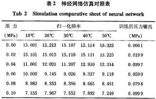 現(xiàn)在礦井下事故頻繁發(fā)生,用AE聲發(fā)射預(yù)測(cè)瓦斯突發(fā)是非接觸測(cè)量一種趨勢(shì),由于環(huán)境條件限制,用SAW壓力傳感器作為接收聲發(fā)射信號(hào)的傳感器,就必須保證測(cè)量信號(hào)的高準(zhǔn)確性和智能性特點(diǎn),而用神經(jīng)模糊控制對(duì)溫度進(jìn)行了智能補(bǔ)償,加上先進(jìn)的封裝技術(shù),可使SAW在實(shí)際的瓦斯預(yù)測(cè)測(cè)量中發(fā)揮巨大作用。通過(guò)實(shí)驗(yàn)驗(yàn)證,此種方法可行。在MATLAB6.0環(huán)境下進(jìn)行神經(jīng)網(wǎng)絡(luò)的訓(xùn)練和仿真,通過(guò)神經(jīng)網(wǎng)絡(luò)工具箱,編制相應(yīng)的仿真訓(xùn)練程序,實(shí)現(xiàn)仿真過(guò)程。在仿真時(shí),隨機(jī)選取幾組頻率-溫度作為輸入,最后,進(jìn)行標(biāo)定壓力值和仿真結(jié)果的比較。仿真數(shù)據(jù)結(jié)果如表2。