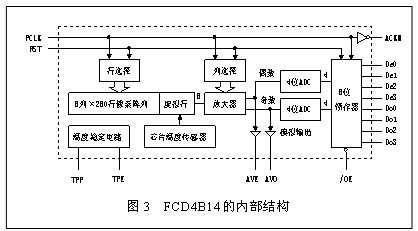 FCD4B14的內(nèi)部結(jié)構(gòu)如圖3所示。從圖3可見,芯片內(nèi)部電路分為傳感器和資料轉(zhuǎn)換兩個(gè)主要部分。在傳感數(shù)組中,當(dāng) 280行中的某一行被選中時(shí),被選擇行的每一個(gè)象素的電信號(hào)傳送到放大器(一次一列)放大。在有兩列被同時(shí)選中時(shí)(奇數(shù)的和偶數(shù)的),兩個(gè)特定的象素信息被傳送到兩個(gè)4位A/D轉(zhuǎn)換器,兩個(gè)象素就可在同一個(gè)時(shí)鐘脈沖時(shí)間內(nèi)被讀出。