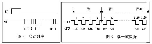 讀一幀數(shù)據(jù)時(shí)序如圖5所示。讀取幀數(shù)據(jù),一幀包括280個(gè)真實(shí)的行和一個(gè)虛擬的行,每行8個(gè)象素。由于一次輸出兩個(gè)象素,因此系統(tǒng)必須發(fā)送281´4=1124個(gè)時(shí)鐘才能讀完一幀。當(dāng)讀幀數(shù)據(jù)時(shí),RST必須為低電平。