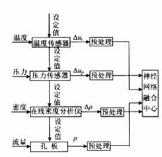 在用孔板進行流量測量時,設(shè)被測實際流量為Q,孔板的輸 出差壓為p。工作中,孔板的測量結(jié)果還受到被測介質(zhì)的溫度、壓力和密度與設(shè)定的介質(zhì)溫度、壓力和密度的偏差量Δt、Δp、Δρ的影響,被測實際流量Q實際上為四元函數(shù),即Q=f(Δt,Δp,Δρ,p)。因此,在使用孔板的同時,采用溫度傳感器、壓力傳感器和在線密度分析儀獲得介質(zhì)的實時特性信息,從而得到與孔板設(shè)計時設(shè)定的工作特性信息的偏差量;然后,將獲得的各種信息經(jīng)預(yù)處理后(包括整形、濾波、去噪,歸一化等),送入融合中心,融合中心采用神經(jīng)網(wǎng)絡(luò)的方法對數(shù)據(jù)進行融合處理。融合后的數(shù)據(jù)集中了4個傳感器的信息,極大的提高了孔板的測量精度。系統(tǒng)的配置結(jié)構(gòu)如圖1所示。