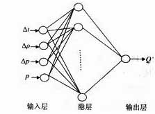 神經(jīng)網(wǎng)絡(luò)由輸入層、隱含層及輸出層組成。整個網(wǎng)絡(luò)的特性決定于相鄰層間神經(jīng)元的連接權(quán)及隱層中神經(jīng)元的閾值。在訓(xùn)練過程中,以孔板的輸出差壓p、介質(zhì)溫度、壓力和密度與設(shè)定的介質(zhì)溫度、壓力和密度的偏差量Δt、Δp、Δρ作為神經(jīng)網(wǎng)絡(luò)的輸入;輸出為介質(zhì)流量Q′,其值 最終將以某個允許偏差逼近被測介質(zhì)的實際流量Q。網(wǎng)絡(luò)結(jié)構(gòu)如圖3所示。