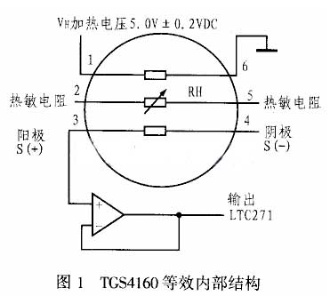 TGS4160二氧化碳傳感器是一種內(nèi)含熱敏電阻的混合式CO2敏感元件。該元件在兩個電極之間充有陽離子固體電解質(zhì)。它的陰極由鋰碳酸鹽和鍍金材料制成,而陽極只是鍍金材料。該敏感元件的基襯是用對苯二酯聚乙烯和玻璃纖維加固,然后采用不銹鋼網(wǎng)做圓柱型封裝。元件的內(nèi)層采用100目雙層不銹鋼網(wǎng)套在鍍鎳銅環(huán)上,并用高強(qiáng)度樹脂粘合劑與基襯固定在一起。其外層頂蓋上又罩上了一層60目的不銹鋼網(wǎng)。為了達(dá)到降低干擾氣體影響的目的,TGS4160在內(nèi)外兩層不銹鋼網(wǎng)之間還填充有吸附材料(沸石)。傳感器的6個引腳通過0.1mm的箔導(dǎo)線與內(nèi)部相連。其等效的內(nèi)部結(jié)構(gòu)見圖1所示。圖中,陽極與傳感器的第3腳S(+)相連,陰極與傳感器的第4腳S(-)相連,Pt加熱器與傳感器的第1,6腳相連,內(nèi)部熱敏電阻與傳感器的第2,5腳相連。內(nèi)部熱敏電阻的作用是通過該電阻探測環(huán)境溫度,以便對該傳感器進(jìn)行溫度補(bǔ)償,從而使校正后的測量值更加準(zhǔn)確。