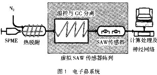 本文提出一種基于虛擬氣體傳感器陣列的新型無創(chuàng)的用于檢測肺癌的電子鼻。該電子鼻包含一個由固相微萃取(solid phase microextraction,SPME)和毛細管柱(gas chromatography,GC)組成的前處理裝置來實現(xiàn)病人呼吸氣體中VOCs的濃縮吸附、脫附和分離,隨后通過一個表面涂覆聚異丁稀薄膜差動結構的SAW傳感器對分離后的有機氣體成分進行定量檢測(圖1)。