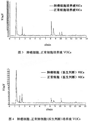 對于選定的11種肺癌特征VOCs氣體來說,實驗證實了這些VOCs氣體跟肺癌的相關性很大。結果表明,該電子鼻能夠很好地檢測出肺癌病人呼吸氣體內的這些VOCs氣體種類和含量,肺癌病人的診斷率在75%以上。為了能更精確地確定肺癌患者的特征性氣體,參考病理解釋,進行了細胞水平的對比實驗,用該電子鼻對肺癌細胞培養(yǎng)液中VOCs進行了檢測。將肺癌組織和同體的正常肺部組織標本,分別進行細胞培養(yǎng)。獲取細胞培養(yǎng)后的培養(yǎng)液,進行SPME萃取,用GC進行分析。如圖3所示的是用GC所得的肺癌細胞培養(yǎng)液和正常肺部細胞培養(yǎng)液的譜圖,與正常細胞相比,確定肺癌細胞的新陳代謝氣體中有特異性氣體存在。其中一例肺癌細胞和同體癌旁正常肺部細胞培養(yǎng)液分析結果如圖4所示。對比二者的峰形圖,可以發(fā)現(xiàn)雖然在峰高上存在差異,但出峰位置幾乎全都相同,相似的分析結果讓人懷疑該例癌旁正常肺部組織其實已經發(fā)生了癌變。實驗對培養(yǎng)的細胞進行了電鏡觀察,發(fā)現(xiàn)醫(yī)生判斷的正常肺部細胞圖像,已經出現(xiàn)了細胞重疊現(xiàn)象,這是正常細胞所不會出現(xiàn)的?梢娙庋蹮o法正確判斷的已經發(fā)生癌變的肺部組織通過我們的實驗方法也能被識別出來,所以該實驗的結果對于呼吸氣體進行肺癌的早期初篩有非常重要的意義。