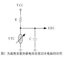 圖3為典型負(fù)溫度系數(shù)熱敏電阻的應(yīng)用電路。利用筆記本電腦嵌入式微控制器的模數(shù)轉(zhuǎn)換器 (ADC) 所讀到的電壓值推算出NTC的電阻值,因而推算出環(huán)境溫度。利用負(fù)溫度系數(shù)熱敏電阻測(cè)量溫度時(shí)誤差很大,誤差來(lái)源包括NTC本身的誤差、提升電阻的誤差、偏壓電源 (VCC) 的誤差、ADC的誤差及測(cè)量噪聲所造成的誤差。從成本考慮,如果只考慮負(fù)溫度系數(shù)熱敏電阻本身的價(jià)格,這是一個(gè)廉價(jià)的解決方案。但若把偏壓電路和額外的ADC成本一并考慮進(jìn)去,成本可能增加。