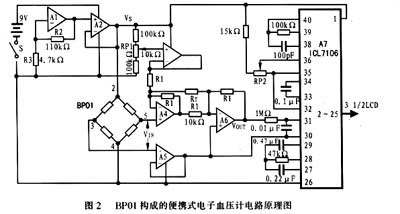 用BP01構(gòu)成的便攜式電子血壓計(jì)的原理電路如圖2所示,它由偏置電源電路(A1、A2)、前置處理電路(A3~A6)、顯示電路(A7)和壓力傳感器(BP01)組成,該血壓計(jì)的血壓測(cè)量范圍為0~200mmHg,分辨率為0.1mmHg,工作電源為一節(jié)9V迭層電池,F(xiàn)將血壓計(jì)中各主要電路的工作原理分述如下: