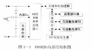 125℃,精度0.5℃。傳感器和上位機之間只須一根總線即可完成信息的讀寫,DS1820本身供電、數(shù)據(jù)的讀寫和溫度變換所需功率均來自于該總線,不需要額外的電源。每片DS1820均含有一個惟一的64位硅串行數(shù),通過識別該碼可以區(qū)分不同的傳感器,因此可以在一根總線上掛接多個DS1820,由上位機通過選擇傳感器和硅串行數(shù)對選定的傳感器進行讀、寫、啟動轉(zhuǎn)換和設置報警參數(shù)等操作,從而在結(jié)構(gòu)上大大簡化系統(tǒng)設計和安裝維護工作。傳感器的內(nèi)部結(jié)構(gòu)和外接引線如圖1—1所示。
