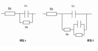 在模型A中電阻器Rs表示金屬所在的溶液,而電容Cc表示金屬表面的保護(hù)涂層或涂料,這表示初始涂層的電容。經(jīng)過一段時(shí)間后,水滲入涂層中形成新的液體和金屬界面。隨著金屬的腐蝕,通過溶液與金屬之間的保護(hù)涂層形成離子導(dǎo)電路徑。這可以用Rx與Cc并聯(lián)模型來(lái)表示。另外,有些模型(模型B)還有一個(gè)附加的R和C并聯(lián)起來(lái)再與Rx串聯(lián)的電路來(lái)表示金屬保護(hù)涂層隨著時(shí)間變化的分層模型。