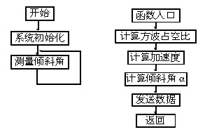 由于前面算法所述,系統(tǒng)硬件電路中,由于所選用芯片的測量方法的緣故,電路板的兩條互相垂直的邊應與平面成45度角,但實際卻很難保證45度角,故首先應測試其實際角度,并將該角度存入寄存器中,在后面的應用中,可以將初始數(shù)據(jù)做為基準,進行測試以確保角度計算的準確性。初始數(shù)據(jù)標定在設計中采用自恢復按鍵脈沖觸發(fā)單片機的中斷調用來實現(xiàn)。在本設計中,按照如圖2所示的流程編程實現(xiàn)了車輛在行駛過程中的微小角度的測量以及其他輔助功能的實現(xiàn)。