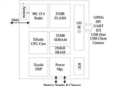 在設(shè)計(jì)無(wú)線傳感器網(wǎng)絡(luò)網(wǎng)關(guān)時(shí),需要較強(qiáng)的數(shù)據(jù)處理能力,用以實(shí)現(xiàn)復(fù)雜路由協(xié)議以及信息處理等。如圖5所示Crossbow的imote2節(jié)點(diǎn)采用了MarvellPXA271高性能、低功耗處理器。該處理器使用動(dòng)態(tài)電壓調(diào)節(jié)技術(shù),頻率范圍13MHz~416MHz,可工作于低電壓(0.85V)低頻率(13MHz)模式,具備了優(yōu)良的動(dòng)態(tài)電源管理技術(shù)。此外,該處理器封裝內(nèi)集成三個(gè)芯片256KBSRAM,32MBFLASH以及32MBSDRAM,減小了體積。通過(guò)提供多種I/O,能夠靈活的支持不同種類的傳感器。該處理器還支持一個(gè)MMX協(xié)處理器,提高多媒體處理能力,可以用于無(wú)線多媒體傳感器網(wǎng)絡(luò)中的語(yǔ)音和圖像處理。Imote2使用TI的CC2420ZigBee射頻芯片,支持2.4GHz、16通道250kb/s數(shù)據(jù)傳輸,發(fā)送功率-24~0dBm。有效通訊距離是30米,可以通過(guò)SMA接口外接天線來(lái)增加傳輸距離。
