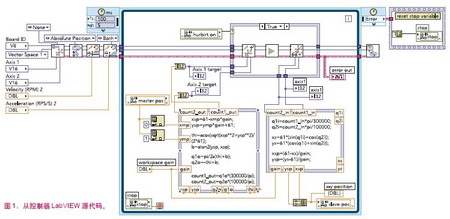 研究者可以迅速地將他們的主從控制器運(yùn)算法則輸入LabVIEW,然后采用高級程序界面裝載動(dòng)力設(shè)備和傳感器。通過采用實(shí)際硬件裝載運(yùn)算法則,他們能夠用真實(shí)的數(shù)據(jù)檢驗(yàn)理論的正確性。圖1顯示了研究員操作從控制器位置的圖形源碼。另外,軟件工具提供了高級采集界面,比如timed-loop循環(huán)功能。timed-loop循環(huán)是一種LabVIEW程序結(jié)構(gòu),可采集優(yōu)先權(quán)和多線程細(xì)節(jié)數(shù)據(jù)。通過這些不同類型的采集方法,工程師和科學(xué)家們可以很容易的在他們的軟件上應(yīng)用多線程功能。這給研究員提供了更多時(shí)間來完善設(shè)計(jì)的產(chǎn)品,而不用花時(shí)間在低端代碼開發(fā)上。