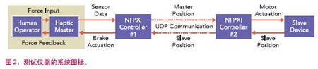 這項(xiàng)研究的測試儀器采用了二自由度(DOF)操縱器作為主設(shè)備控制作為從設(shè)備的一自由度(DOF)線性電機(jī)。主從設(shè)備之間沒有物理連接;取而代之的是,PIX實(shí)時(shí)控制系統(tǒng)與主設(shè)備連接,另外一系統(tǒng)與從設(shè)備連接,如圖2所示。PIX系統(tǒng)1采用了NI LabVIEW上的確定性應(yīng)用程序,可在伽馬力傳感器和主操縱器上的光學(xué)編碼器上讀出來。研究員采用該數(shù)據(jù)來確定主設(shè)備位置,并將位置傳送給PXI系統(tǒng)2。