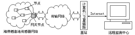 傳感器網(wǎng)絡(luò)在生態(tài)環(huán)境監(jiān)測方面的應(yīng)用非常典型。美國加州大學(xué)伯克利分校計(jì)算機(jī)系Intel實(shí)驗(yàn)室和大西洋學(xué)院(The College of the Atlantic, COA)聯(lián)合開展了一個(gè)名為 “in-situ”的利用傳感器網(wǎng)絡(luò)監(jiān)控海島生態(tài)環(huán)境的項(xiàng)目。該研究組在大鴨島(Great Duck Island)上部署了由43個(gè)傳感器節(jié)點(diǎn)組成的傳感器網(wǎng)絡(luò),節(jié)點(diǎn)上安裝有多種傳感器以監(jiān)測海島上不同類型的數(shù)據(jù)。如使用光敏傳感器、數(shù)字溫濕度傳感器和壓力傳感器監(jiān)測海燕地下巢穴的微觀環(huán)境;使用低能耗的被動紅外傳感器監(jiān)測巢穴的使用情況,系統(tǒng)的結(jié)構(gòu)框圖如圖3所示。