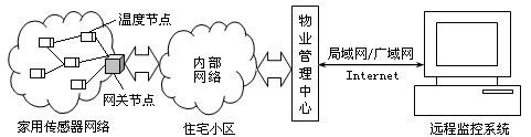無線傳感器網(wǎng)絡(luò)還可以應(yīng)用于家居中,其家用遠(yuǎn)程環(huán)境監(jiān)控系統(tǒng)的結(jié)構(gòu)框圖如圖4所示。通過在家電和家具中嵌入傳感器節(jié)點(diǎn),通過無線網(wǎng)絡(luò)與Internet連接在一起,用戶可以通過遠(yuǎn)程監(jiān)控系統(tǒng)完成對家電的遠(yuǎn)程遙控,例如用戶可以在回家之前半小時(shí)打開空調(diào),這樣回家的時(shí)候就可以直接享受適合的室溫,從而給用戶提供更加舒適、方便和更具人性化的智能家居環(huán)境。