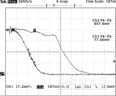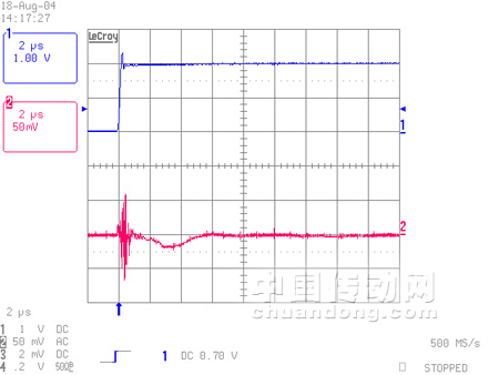 對(duì)于在高EMC環(huán)境所使用的傳感器來(lái)說(shuō),其中一個(gè)關(guān)鍵參數(shù)是在電壓跳變(共模)之后的性能。圖3記錄了6 KV/s電流變化率(dV/dt)的情況,同時(shí)給出了當(dāng)輸出為大約20mV時(shí)跳過(guò)一個(gè)偏差之后的狀態(tài),這一結(jié)果與3%標(biāo)稱(chēng)值的漂移相一致。性能是平衡的,因此在不產(chǎn)生偏差的情況下可以對(duì)其進(jìn)行外部或內(nèi)部過(guò)濾。