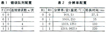 F1/F0 錯(cuò)誤隊(duì)列配置位。只有溫度連續(xù)超限n次后,報(bào)警才會(huì)輸出。參數(shù)n由F1和F0來(lái)設(shè)置,設(shè)置錯(cuò)誤隊(duì)列的目的是防止環(huán)境噪聲對(duì)報(bào)警輸出的影響。具體配置參數(shù)如表1所列。