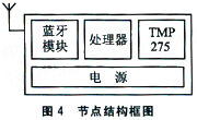 本文的討論是以基于藍(lán)牙(Bluetooth)技術(shù)的家庭環(huán)境監(jiān)控系統(tǒng)的節(jié)點(diǎn)為平臺(tái),介紹溫度傳感器TMP275在環(huán)境監(jiān)控中的具體應(yīng)用。該節(jié)點(diǎn)包括處理器、藍(lán)牙模塊、溫度傳感器TMP275和電源4部分,如圖4所示。