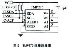 TMP275的兩線串行接口(引腳SCL、SDA)與I2C總線接口兼容,可以直接與其相連,從而大大降低了設(shè)計(jì)難度。當(dāng)測(cè)量溫度超過(guò)用戶設(shè)定的最高溫度或低于最低溫度時(shí),引腳ALERT輸出高電平或低電平(可以通過(guò)配置寄存器來(lái)實(shí)現(xiàn))。上述3個(gè)引腳在實(shí)際連接中需要上拉電阻。引腳A0、A1、A2可以接地或高電平,用于決定芯片的器什地址(有8個(gè))。TMP275的外圍電路原理圖如圖2所示。