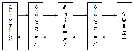由于SBE 37-SI MicroCAT溫鹽深傳感器所提供的RS232數(shù)據(jù)格式與常用的導(dǎo)航設(shè)備數(shù)據(jù)格式不同,不能直接與潛水器綜合導(dǎo)航顯示控制臺系統(tǒng)現(xiàn)連接進(jìn)行數(shù)據(jù)交換。為了方便通信,本文作者在實(shí)際的工程應(yīng)用中設(shè)計(jì)了一個數(shù)據(jù)格式轉(zhuǎn)換電路板,電路的結(jié)構(gòu)如圖2所示。