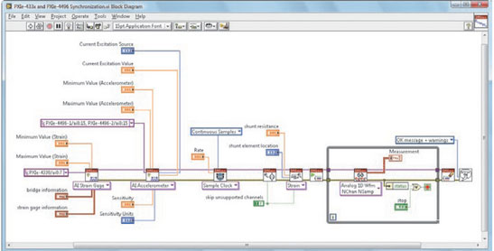 SC Express模塊使用PXI Express總線提供一個(gè)機(jī)箱或多個(gè)機(jī)箱設(shè)備之間的緊密同步。舉例而言,NI PXIe-4330橋式傳感器輸入模塊在單一機(jī)箱中單個(gè)模塊或不同模塊之間具有小于100 ns的通道間偏差。此外,NI用全新的方法增強(qiáng)了NI-DAQmx驅(qū)動(dòng)程序軟件,在單個(gè)機(jī)箱中配置多個(gè)SC Express模塊進(jìn)行同步。如下圖所示,您可以在NI LabVIEW圖形化編程環(huán)境或基于文本的通用語言(例如.NET)使用單個(gè)NI-DAQmx多設(shè)備任務(wù)配置并讀取來自系統(tǒng)中多個(gè)設(shè)備的數(shù)據(jù),從而大大簡化了所需的代碼。如果您使用這個(gè)編程方法,在無需犧牲性能的情況下,驅(qū)動(dòng)程序自動(dòng)配置所有定時(shí)和觸發(fā)線路。