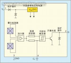 如圖1所示,一個(gè)施密特觸發(fā)器用來(lái)對(duì)該信號(hào)進(jìn)行數(shù)字化,一個(gè)開(kāi)集電極輸出電路提供輸出信號(hào)。芯片上還集成了過(guò)壓保護(hù)、反極性保護(hù)和抗電磁干擾功能,因而可以應(yīng)用在汽車中常見(jiàn)的惡劣環(huán)境。