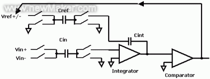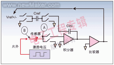 電容充電然后反過來提供給積分器,這樣積分器得到一個負(fù)的參考電壓。因此輸入端的高壓導(dǎo)致大量邏輯部分,它們反過來頻繁地運用(負(fù))參考電壓。密度通過下面的數(shù)字濾波轉(zhuǎn)換成一個數(shù)字化的數(shù)值。經(jīng)典的Σ-Δ轉(zhuǎn)換器將未知的電壓與已知的電壓相比較,即采用兩個已知的電容(通常相等)來作此比較。