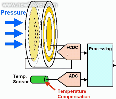 由于熱擴(kuò)散,溫度傳感器需要考慮改變的幾何形狀。設(shè)想兩個電極中的一個附著在芯片上,另一個附著在由金屬或陶瓷構(gòu)成的支架上,因此支架自己作為傳感器。以陶瓷為例,能夠承受非常高的壓力和侵入的媒介。與經(jīng)典的惠斯通電橋相比較,電容壓力傳感器的主要優(yōu)點是對輸入電流的要求更低,使得他們特別適合于諸如輪胎壓力控制之類的應(yīng)用。